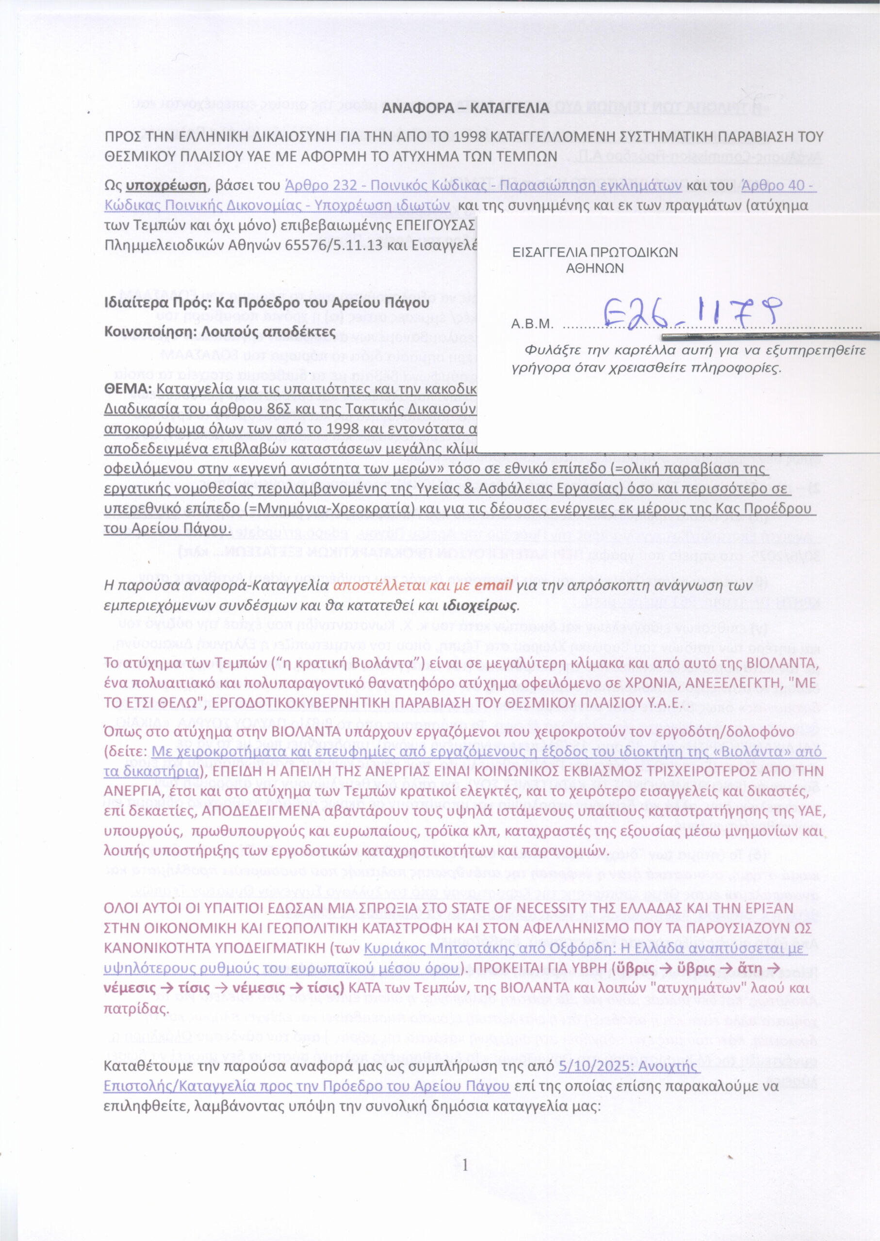 Κατατέθηκε σήμερα 20 Φεβ. 2026 στην κα Πρόεδρο του Αρείου Πάγου “Aναφορά – Kαταγγελία προς την Ελληνική Δικαιοσύνη για την από το 1998 καταγγελλόμενη συστηματική παραβίαση του θεσμικού πλαισίου ΥΑE με αφορμή το ατύχημα των Τεμπών”. Ελαβε Αριθ. Πρωτοκ. 428/20-2-2026.